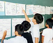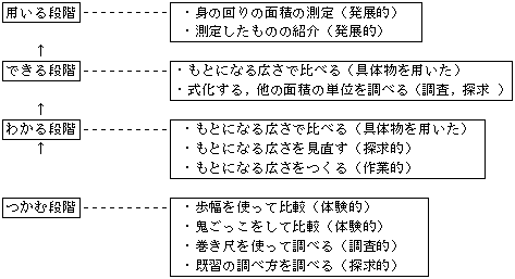 4.おわりに 調べたことを,確かめて,見直し,さらに確かめるという,算数的活動を工夫したことで,体験的活動と思考活動を繰り返し行わせることができ,面積の意味や求め方を考えながら面積の量感を育てることができた。これからの算数教育において,意味をよく理解し数学的に工夫し考え,習熟し活用できることが大切になってくるが,同時に,数や量の感覚を豊かにしていくことは,それらを培う上で必要なことだと考える。 | |||||||||||||||||||||||||||||||||||||||||