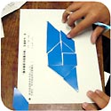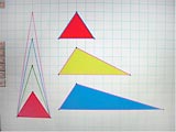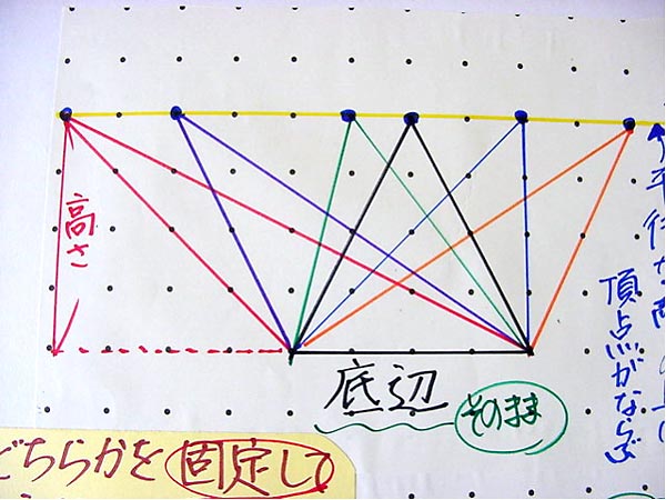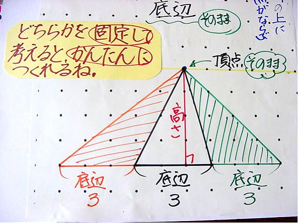 | → | ジオボードで試行錯誤させる。「面積が等しい三角形」の掲示物を参考にさせる。 |