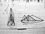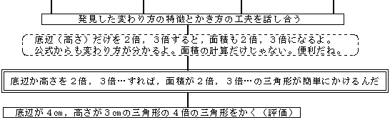 | → | 面積が2倍,3倍の三角形を書いたワークシートを与え,底辺の長さと高さを測ることで,どこが変化しているか調べさせる。 |