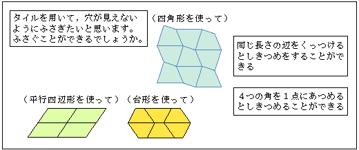 | 2. | 平行四辺形や台形が敷き詰められることを予想し,確かめる。 |