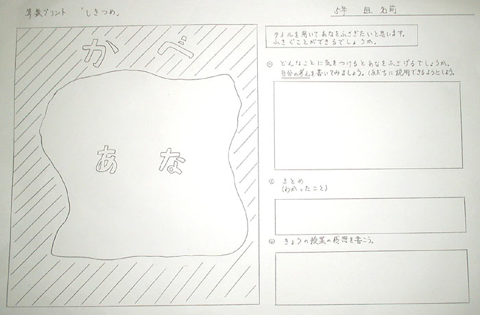 | T | : | 今日はこういう問題です。先生の家の壁に穴があいてしまいました。困っちゃったね。どうしよう。みんなならどうする。