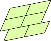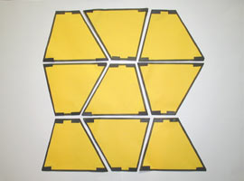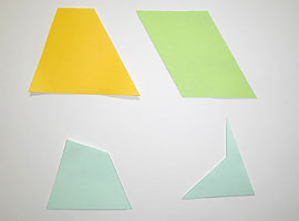 | ・ | 黒板で平行四辺形のタイルや台形のタイルをずらしたり,回したりして見せる。 |