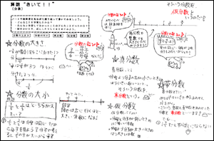 単元が終わるごとに振り返ってまとめをする活動を位置づけた。この活動では,学習内容の再構成をし,学んだことを結びつけ,関連づけて考えることで理解を確かにしていこうとするものである。右の子どもの「算数“きいて!!”」に見られるように,分数の大小比較を帯分数,整数等の混合の場合へと広げてみようとする姿や = などの相当関係への気づき,さらには,異分母分数の比較へと興味・関心が向く発展的な考えをする子どもの姿が見られた。
