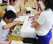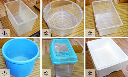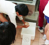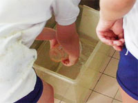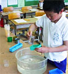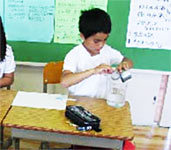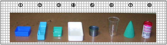 この授業を終えて ほとんどの児童が楽しかった。また,いろいろなものをはかってみたい。と学習プリントに書いていた。また,同じ大きさのコップを使えば,入る水のかさを比べることができることを理解できたと思う。 第2時 「1リットルますを使って,6つの容器のかさを調べる」 第2時では,1リットルますの必要性を子どもたちと考えた後,実際に前時使った容器のかさをはかってみた。はしたをはかる必要性から,規準となるもっと小さいますが必要になることがわかった。 第3時 「1デシリットルますを使って,8つの容器のかさを調べる」 ![]()