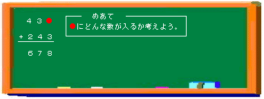 4.授業のポイント ここでは,筆算についての理解を深める一つとして,「数あて」をする。0〜9までの数字を順にあてはめていけば,答えは求められるが,ここでは,筆算の仕組みを手がかりにして答えを求めさせたい。単に,あてはまる数を見つけることに終わるのではなく,なぜ,そう考えるのかを,既習事項をもとにして説明していくことを中心とした話し合い活動をさせていきたい。そうする中で,児童は筆算の仕組みの理解が深まり,相手に自分の考えを伝える力をも育てていくことができる。 5.授業の実際