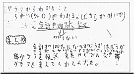 | ・ | 自分たちの班で考えたグラフは,実際かいてみてとてもよかった。それは,グラフとグラフの間の線の傾き具合で多いか少ないかがわかるから。 |