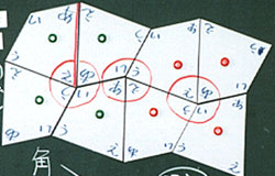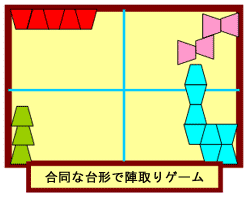 6.まとめ この授業が終わった後の子どもたちは,三角形の内角の和が180度であることも自分たちの力で発見した。そして,五角形もこの前の単元で合同な四角形を書くのに2つの三角形に分けて考えた経験から五角形を四角形と三角形に分けたり,3つの三角形に分けたりして,5つの角の和が540度であることも突き止めた。 さらに,ノートには書けないような百角形の100個の角の和の求め方まで考えてしまった。パソコンのソフトを使った「合同な図形の陣取りゲーム」による学習は,「遊び」を発展させていくことで楽しく意欲的に追究していこうとする子どもたちを育てることができたと思う。下はその時の子どもの授業日記である。