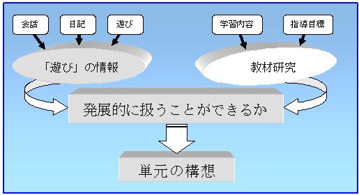 3.研究の方法 「遊び」ならば何でもいいというわけではない。「遊び」が子どもたちにとって楽しいものでなければ,その「遊び」を授業に取り入れ,発展させたところで追究意欲は生まれてこないからである。そこで,子どもたちの身近な生活の中で興味や関心を高めている「遊び」の発見が大切となってくる。 「遊び」の発見はいろいろな場面で行われなければならない。子どもたちとする普段の会話の中や子どもたちの書く毎日の日記の内容,放課や授業後の遊びなどによく目を配り「遊び」の情報を収集していくのである。 一方で,これから学習していく単元の中で「遊び」を取り入れて学習を進めていけそうな単元はないか教材研究を進めていく。 そして,「遊び」の情報と教材研究を合わせて考えたとき,「遊び」を発展的に扱い追究活動ができるかを見通すのである。