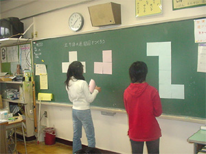 6.授業を終えて 条件をかえる課題を導入に使ったが児童の反応はよかったように思う。しかしその分だけ時間がかかってしまい,4時間目の授業実践では最後が時間切れになってしまった。どの子も家で,きちんと確認をしてくることができた。6枚の正方形のカードを使って具体的に操作させたのは,立体にたいする感覚を養うのには有効だったと感じている。いつもはあまり算数に興味示さない児童も一生懸命に取り組むことができていた。7.おわりに 基本的にどの時間も「予想」→「具体物での操作活動」→「言葉・図によるまとめ」という流れを大切にした。第3時,4時で使った6枚の正方形カードの展開図はいつもノートにはさんでおき,空間における位置関係を確認する時に利用した。しかし,「予想」→「具体物での操作活動」には意欲的に取り組むが,「言葉・図によるまとめ」の場面では意欲が低下するように感じられた。今後は,言葉や図にまとめることの良さを児童自身が感じられるような授業展開を工夫し,実践に取り組んでいきたい。 |