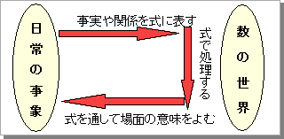 1.はじめに 1年生の児童は,動物や食べ物の具体物や数図ブロックを操作しながらとても楽しそうに学習に取り組む。数の合成・分解では,具体物を操作しながらなら,「7個は2個と5個」と多くの児童が答えられる。ところが,「7は2と□」と数字だけで表わされると,何を答えればよいのか分らなくなったり,7と2をたしてしまったりして戸惑う姿が見られる。これは,問題場面に含まれる数の関係を,具体物と対応させて正しくつかむことができていないことに原因があると考える。そこで,加法や減法の学習において,式が何を表しているのかに気付いたり,立式の誤りに気付いたりできるようになるために,問題場面と式を関連付けて考えるようにさせることが大切である。 こうすることによって,右図のように「事実や関係を式に表す」「式で処理して考えを進める」「式を通して場面の意味をよむ」などの力を併せもち,日常の事象と数の世界を結び付ける,「式の意味を正しくとらえる児童」を育成できると考えた。2.単元名「あわせて いくつ ふえると いくつ」 3.単元の目標