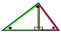 三角形の内角の和を調べる際には,前時で取り上げた直角三角形と合同な三角形に分割できるような三角形を子ども一人ひとりにカードにしてもたせ,既習の直角三角形の内角の和を使ったり,角を集めたりするなど工夫して三角形の内角の和が見いだせるようにする。