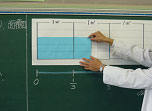 基礎的な学習のグループでは,面積図や線分図のかき方,単位分数の見つけ方,問題場面の把握や分数の計算のしくみをスモールステップで押さえていきながら,分数×分数や分数÷分数の計算のしくみが確実に定着することをねらう。また,問題場面に応じ,実際に活動したり,面積図を塗り分けたり,空操作をしたりする具体的な算数的活動を大切にする。発展的な学習のグループでは,既習事項を使い,自力解決主体の学習展開を進め,分数×分数や分数÷分数のしくみの法則性を捉えさせることをねらう。したがって,指導に当たっては式や面積図,線分図,関係図等を使って多様な求め方で問題解決をする時間を十分確保し,児童同士の練り合いを大切にしたい。どちらのコースでも,少人数という点を生かし,きめ細やかな指導で知識理解の定着を図るだけでなく,一人一人が自分の考えに自信を持ち筋道立てて説明したり, 友達の考えを想像して説明し たり,自分の考えと比べながら聞いたりすることで練り合いの力を高めたい。 自力解決の場面では,既習事項とのつながりを意識し,小数の計算と同じように,かける数やわる数が分数の場合でも,その大きさを1と比べたり,問題場面を空操作したりすることで答えの大きさを予測させたい。また,今までの分数の学習で用いてきた分数スケールを重ねることによってできる面積図の理解を図り,その面積図や線分図をもとに計算のしくみを視覚的にとらえさせる。さらに除法の性質を利用し,既習の式に変換することで分数の除法の意味と計算の仕方を理解させたい。