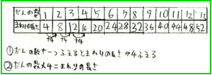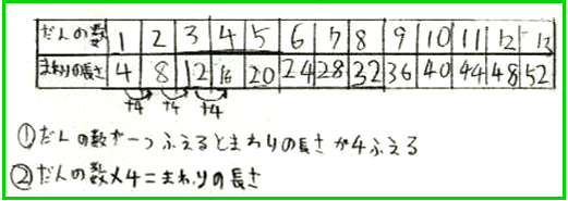 また,2量の関係を分かりやすく表すためにどうしたらよいか考えさせたい。 表を用いること 少ない場合から順に調べて,類推しきまりを見つけること 式に表し,一般化することを考えさせる。