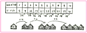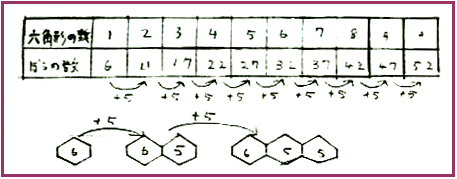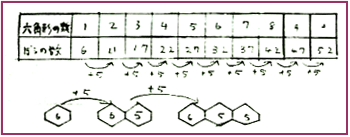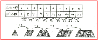 段の数が1増えると,ひごの増える数は,6,8,10・・・と2ずつ増えている。 |