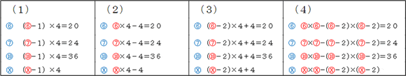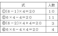 (1)のような考え方を表す式は,5×4=20というように書く児童が多いが,文字を使って一般化するためには(E−1)×4=20というようにした方がよい。そこで,「5」の意味を全体で考えさせると良い。同様にして,(3)の式にあるような3つの「4」の表す意味,(4)の2つの「4」の表す意味についても図と結びつけながら確認していく。このように,ただ式に表すだけでなく,その式と図形を結びつけて,何をどのように表したかを説明できるようにさせることが式の読みと表し方を習得させるためには大切である。そして,4つの式の左側に板書したそれぞれのEと式中のEは,正方形と見た場合,1辺に6つ並ぶ場合の式ということを意識づけるために意図的に書いたり,囲んだりしたものである。 文字(X)を使った式で表す。