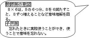 2年生で学習するかけ算。楽しみにしている子供は大変多いが,単元が進めば進むほど九九が覚えにくいので意欲が低下し,6,7,8の段などが定着させられないままになってしまうことがある。そこで,下の3つの考えに基づいた指導法の工夫によって,全員に九九を確実にマスターさせることができると考えた。さらに,本単元では子供たちが覚えられたかの確認も効率的でかつわり算を見越した方法を取り入れ実践した。