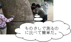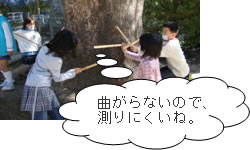 木の幹周り(写真1,2)等の測定を通して,ものさしの限界(曲がらない,誤差が大きい等)を知り,それに伴い,巻き尺のよさ(測定の正確さ,手間がいらないこと等)を感じ取っていた。