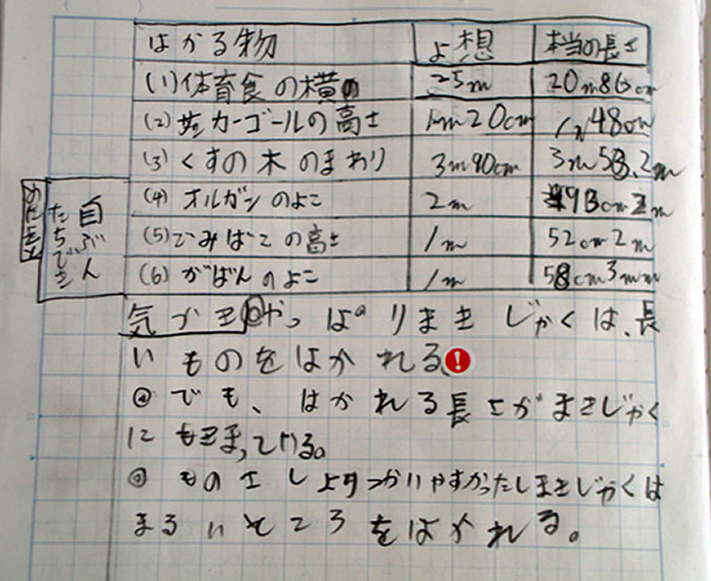 「まきじゃくは長い長さがはかれる」 (資料1),「ふつうのものさしははかりにくいところがあったけど,・・(後略)・・」(資料2)等の表現から,ものさしと比較した巻き尺のよさを自分のノートに記述することができている。子どもたちの胸にすとんと落ちていることが分かる。ノートに記録することは,理解の程度を知る上で大変有効であった。