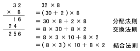 4.授業の成果と今後の課題 (1)アレー図によって児童の数の見方が広がった 児童はかけ算が楽になるように×10を使おうとしていた。そのため,まず10のかたまりを作ることから始め,アレー図を分割していった。これは,児童なりの計算工夫の仕方であり,児童それぞれが工夫しようとしていた。また,視覚的に式の意味を捉えることができるため,自分の考え方を自分で検証したり,式だけではわからない考え方を補説することもできた。 反面,友達が思いつかないことを見つけようとするあまり,分割が多くなりすぎて理解しにくくなる場合もあった。あくまでも,筆算を使わずにできるだけ合理的に計算する方法を考える場面だということを十分押さえて解決活動に入らなければならない。 (2)かけ算の結合法則を導き出すことができた かけ算の交換法則は既習の九九で学習してきている。分配法則は,(ア)や(イ)から簡単に導き出し,理解することができた。これまでの実践では結合法則は導きにくいことが多かったが,ここでは,(エ)や(オ)の図から,縦横の数が同じ長方形のかたまりがいくつあるかを数え,それを式化することによって導き出すことができた。 どの場合にも,総合式で表現するよさを児童に理解させたうえで,考えていくことが大切である。