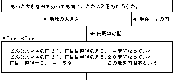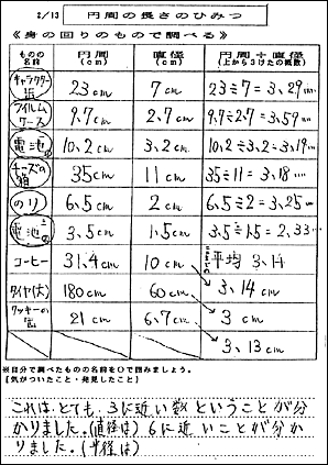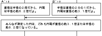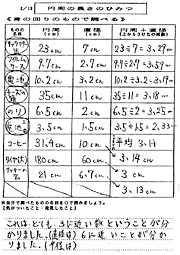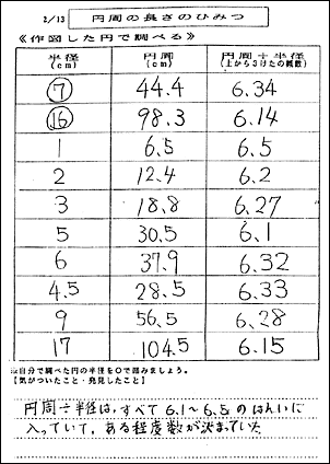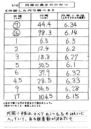 | (2) | 自分が測定した円周と半径・直径との関係を考える。 | |