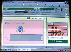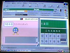 「テストモード」の時は,選んだ問題数だけランダムに出題され,100点満点で採点される。また,「ねっとスクール・ランキング」にメールを通して結果を送信すると,全国ランキングに参加することができる。 4) マウスだけで答えの入力が可能 1年生の子どもたちがコンピュータを活用する時の一番のネックは,キーボード。キーボードから必要な言葉や数字を見つけることに時間がかかってしまう。でも,マウスの操作は大変得意。 この「ねっとスクール」の答えの入力方法は,マウスで画面をクリックする方法が使えるので1年生の子どもたちにもらーくらく。 5) わからない時は「解説とヒント」を見ればOK