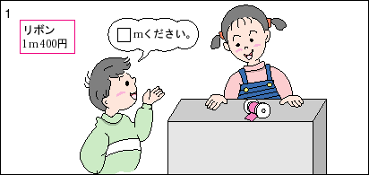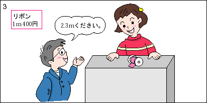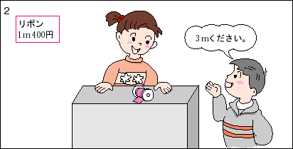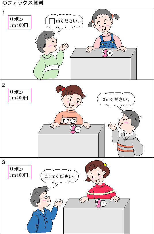 | ・ | 買い物場面であることをつかみ,2mのリボンの代金が求められたところで,2枚目の絵を提示する。その際,話題を「代金を求めること」に焦点化するようにする。 | |