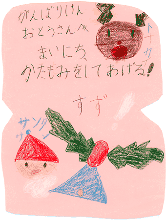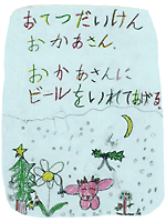 それに対して家族からのメッセージ。「かたたたき,強くなったりよわくなったりしましたが,とても気持ちよかったです」「ほんとうに長生きしてよかった」「弟2人おいて安心して買い物に行けました」「冷やしたビール,そして娘についでもらえるビールはなんともいえない」など家族からのメッセージにほのぼのとした家族愛がうかがえる。「おにいちゃんにサラダを作ってあげるといっていたのに本人が実行するまで黙って見ていました。でも一度も作りません。心のなかではしなくちゃと思っていたのでしょうが」というメッセージもある。してあげたいと思っても,続かなかったりこのようにわすれたりするものである。でも,この活動で家族に対して改めて,思いを馳せたことは確かである。家族の手形をとるとき『お母さんの帰りが遅く,帰ってもいそがしいから手形をとれないので,手形をとる紙いらない』と言い張ったM君の母親から「仕事で帰りが遅いためなかなか肩もみはしてもらえません。でも休みの日などお願いすると気もちよく引き受けてくれます。1〜2分と短いですが結構やさしいMです」というようなメッセージがとどいている。家庭の事情はいろいろあるが,工夫次第で家族のきずなは深まるものである。