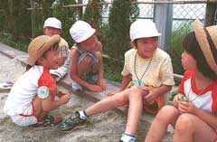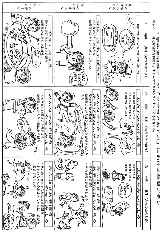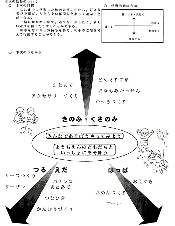 これは,2学期の例である季節とかかわり季節を感じ,その中から遊びを創り,みんなで遊ぶことを繰り返すことで,自然とのかかわりや人とのかかわりは,次第に深まっていくものと考える。また,学期を追うごとに,遊びの質も高まっていくことも期待している。人と人とのかかわりについては,地域の幼稚園児とかかわったり,高齢者の方々とかかわり持つなど,多様な経験をする場を設定することで,かかわりが広がり深まっていくことを期待している。