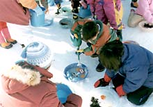 帯広の冬は大変寒く,最低気温が−20 を越えることもたびたびあります。そのため,冬の体育の授業では,校庭に水をまいてスケートリンクを造り,アイススケートの授業を行っています。しかし,年々子どもの遊びが変わり,外遊びより室内の遊びが中心となり,雪や氷を使っての遊びが極端に少ないのが実態です。
