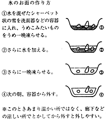 (4) | 水を混ぜたシャーベット状の雪を洗面器などの容器に入れる。 |