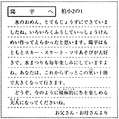 子どもたちは,氷まつり会場を父母と共に訪れ,評価の言葉や手紙を頂いたりして,改めて自分は地域の行事に参加しているんだという気持ちになるようです。