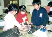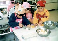 | 子どもたちは,「みそ作り研究会」を開いてみその材料や作り方を確認し合い今後の取り組みについての活動計画を立てていった。この活動計画に従い,実際にスーパーに行ってみその材料を買ったり,大豆を洗って煮るなどの体験活動を積み重ねながら,みそ作り本番への下準備を行った。 |