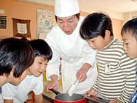 お父さんがシェフの仕事をしているA君は,「柿シャーベット」という料理を皆に紹介し,冷たくて美味しいシャーベットづくりを計画。お父さんの鮮やかな手さばきに感心しながら,自分たちも挑戦。楽しいひとときを味わいました。