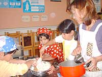 また,子どもたちは,畑で採れたサツマイモでも料理を計画。お母さんたちの知恵と腕を借りて,大学いもや鬼まんじゅう,サツマイモスティックやスイートポテトなど,いろいろなサツマイモの手作り料理に挑戦。子どもたちは,お母さんたちと一緒になって料理を楽しみ,賑やかなパーティーを繰り広げました。