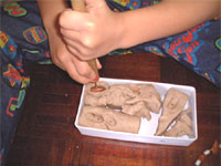 | ・ | どんぐりに穴を空けるのは難しいので粘土を使ったやり方や板に釘を刺した簡易穴あけ器などを使って注意してさせる。