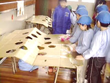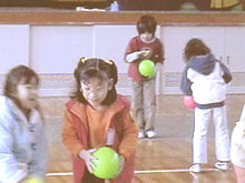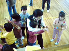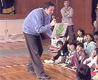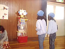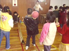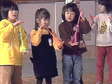 ![]() 2.単元について 子どもたちの遊びをみると,テレビゲームやお絵かき等の室内遊びが主流になり,遊びが個人化・少数化し,友だち同士の関わりや触れ合いが少なくなりつつある。また,おもちゃにしても高価な既製のおもちゃがほとんどで,自分で作ることが少なくなっている。そこで,子どもたちに幅広い遊びに興味・関心を持たせたく,冬休みの課題として遊び調べをさせた。 むかしの遊びは,体を動かし,手足をつかって活動するなど,手先の器用さが要求されるものが多く,集団遊びやルールの大切さを通して友だちとふれあい,みんなと楽しむことができる。 このむかしの遊びを子どもたちに伝えていきたいと思い,地域の方や保護者に「子どもたちと一緒にあそびませんか。」と呼びかけ,お手玉,あやとり,おはじき,こま回し,ペッタン,はごいた等の遊びを教えていただくことにした。 また,国際化が進み,外国文化の波がどんどんうち寄せてきている昨今,外国への興味・関心を持って欲しいと願い,遊びを通して外国の人と交流する機会を持った。 1年生には,アメリカ人の父親を持つ児童もおり,お互いに理解を深めていくことが大切だと考え,今回はアメリカの方に,ゲストティーチャーとして来ていただき,話を聞いたり遊びを教えてもらったりすることにした。 第3次の「つくってあそぼう」では,2年生と合同で遊びを工夫・創造し遊ぶ活動へと発展させた。 指導計画(全15時間) 実施月:1・2月