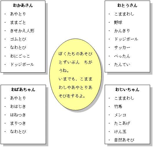 第1次 7時間(1) あそび調べ学習(1時間) (2) あそび発表(2時間) 冬休みのあそび調べの集計 ![]() (3) 名人といっしょにあそぼう(2時間) (4) 教えてもらったことを友だちに伝えよう(2時間)