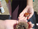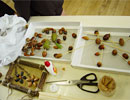 2学期になり,夏休みの間,家に持って帰って世話を続けてきたアサガオの種を児童が持ってきた。また,地域の方からドングリやマツボックリ,ツバキの実などをいただき,教室の中に少しずつ秋が運ばれてきて,「あきがいっぱい」の学習に取り組むこととなった。 本単元では,まず,「秋を感じること」について話し合い,秋のイメージをつかませる。そして学校の秋探しをする。学習園やいこいの池の周りなどで,春に観察した自然との違いを見つけさせる。ドングリや落ち葉を拾ったり,観察したり,遊んだりして,見過ごしていた身の回りの秋に気づき,秋を感じ取らせたい。また,秋の遠足で長居公園に行くので,そこでも秋探しをしてきたいと思う。その後,もらったドングリや木の実,拾ってきたドングリなどを使って地域の人といっしょに,おもちゃを作る活動を通して秋の学びを深めたい。 また,サツマイモの収穫をする。収穫後,切り取った蔓で,なわとびをしたり,電車ごっこをしたり,友達と協力して楽しい活動を行う。その後,蔓でリースを作ったり,サツマイモをよく見て絵手紙を書いたりする。収穫したサツマイモは,10月の学習参観のときに,お家の人といっしょに調理して食べ,収穫の喜びを分かち合う。残った蔓や葉はコンポストに入れるか,堆肥を作る場所に置き,再利用することを伝える。自分たちが育てたサツマイモが無駄なく利用されることで,児童は栽培した充実感がより得られると思われる。 本校は,ビオトープがあり水の中の生き物や鳥などの姿もよく見られ,また栽培活動の盛んな学校でもあるので,町の中の学校にしては自然とふれ合う機会が多いと思われる。しかし,児童は,ふだんの生活の中で自然で遊んだ経験は乏しい。本単元の学習では,見る,聞く,匂いをかぐ,触る,肌で感じる,食べるなどの体験を通して秋という季節を実感し,秋の発見を利用した活動を多く取り入れて,秋を充分楽しませたい。 学習のまとめとして,秋の活動で楽しかったことや分かったことなどを発表する会を行う。身近な自然や周りの様子から発見した秋,楽しんだ秋,きれいだった秋,おいしかった秋などを振り返り,自然や季節の変化に一層関心を持つようにさせたい。 また,本学級の児童は素直で何事にもまじめに取り組む。しかし,大きな声ではきはきと話したり,意欲的に発言したりすることは苦手な児童が多い。そこで,発表会を行うことを通して,集団の前で発表することに慣れ,自信を持つようにさせたい。 単元全体を通して,子どもの学びを確かにするために,