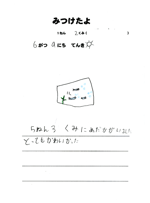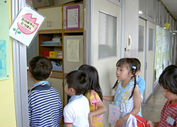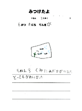 児童たちは,意欲的にさまざまな教室を訪問し,先生たちと話してサインをもらったり,教室を見て自分たちの教室との違いに気付いたりすることができた。見てきた後発見カードに気付いたことを書いたが,「みつけたよ」というカードだけでなく,「おもしろいな」「ふしぎだな」という表題のカードも用意し,多様な発見に対応できるようにした。