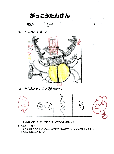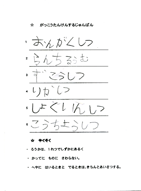 今度は1年生だけ探検に出かけることにした。2年生に案内してもらった場所でもっとくわしく調べたい所や,新しく見てきたい所をグループで相談し,簡単な計画や約束を決めた。教師からも「今度の探検の時は,前よりも多くの先生に挨拶したり,自己紹介したりできるといいね。」と働きかけ,下記のようなカードを用意した。