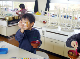 「丸かじりは,味がないと思います。」「おでんなら,みんなが食べられて良いと思います。」 「おでんの材料を聞いてきました。大根,こんにゃく,ウインナー。」「ウインナー?」 |