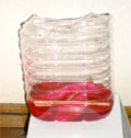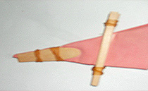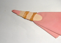 <アイスクリームのスプーンのへらを使って> 布を4つ折りをした後3つ折りにする。スプーのへらは2つに折って布を上下から挟み込み輪ゴムできつく縛る。 |