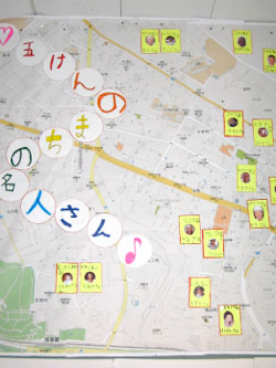 五軒町にある信号音の記録が一目でわかる「ピッポー五軒地図」を提示して,五軒の中から発見した“ふしぎ”を理解できるように補足・説明する。 |