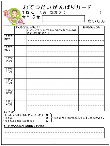 家族の手のワークシートやお手伝いがんばりカードなどの自分の活動を振り返れる学習カードは,家族との関わりを通して自分への気づきが深まるため有効であった。 |