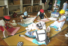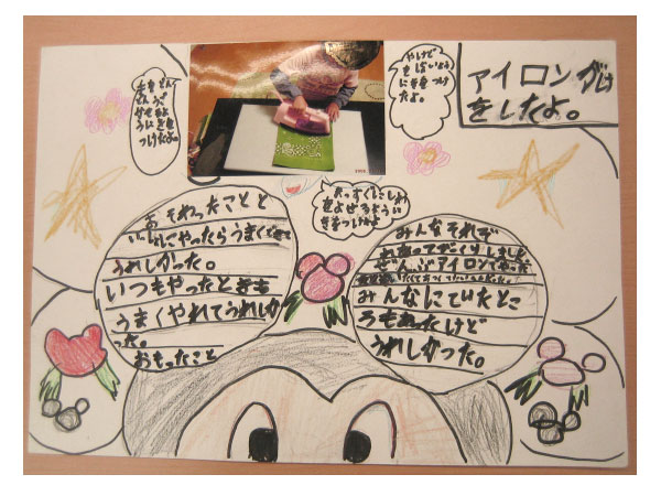 学校で行った「お手つだい大さくせん!」では,どの子どもたちも家庭で実践してきたことを生かし,自信をもって取り組んでいた。ここでは,お互いに自分の家のやり方を伝え合いながら活動することで,違った方法を知ることができ,いろいろな工夫があるという気付きにつながった。また,各グループに保護者のボランティアティーチャーが入ったことにより,アドバイスをもらうなどして進んで活動を行っていた。 |