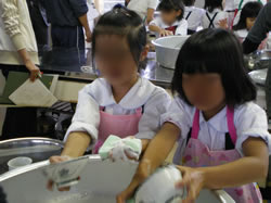 お茶碗あらいでは,家庭科室のお茶碗を用意して,「洗うのが難しい」おはしや大きな皿などに挑戦して洗う練習をした。 |