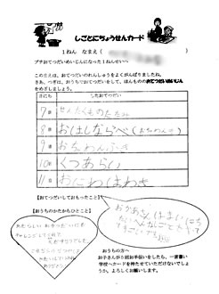 仕事に挑戦カードを配布して,「お手伝い名人めざしてがんばりましょう」と呼びかけた。