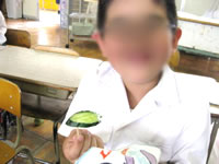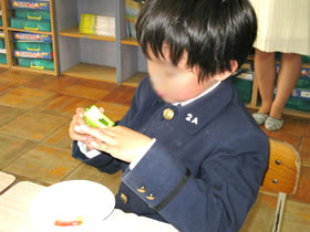 毎日のお世話を続け,野菜を収穫することができた子どもたちは,当然のことながら「食べたい。」という思いをもっていた。そのまま食べるのがいいか,それとも他においしい食べ方はあるのかと考えた末,1年生の学校探検の時になかよくなった調理員さんに相談することにした。調理員さんは,簡単な調理法を教えてくれたり,手伝ってくれたりして,子どもたちは自分が育てた野菜をおいしくいただくことができた。