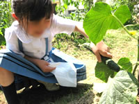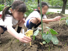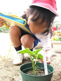 いよいよ野菜を植え育てる段階だが,ここでは自分の野菜を「my畑」と「my鉢」の2カ所で育てることにした。野菜を育てていく過程で,自然に二つの野菜の生長の様子を比べることで,より生長の様子に関心をもったり気付きの質を高めたりすることができると考えたからである。そして,野菜への思いを深めたり,育てることへの意欲を継続することができるようにするために,野菜に名前を付けたり,野菜日記をつけたりするようにした。子どもたちは,「私のキューちゃんは今日も元気かな。」などと言いながら,お世話を続けていた。