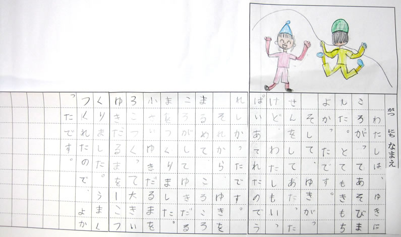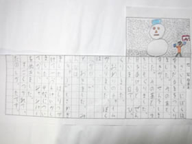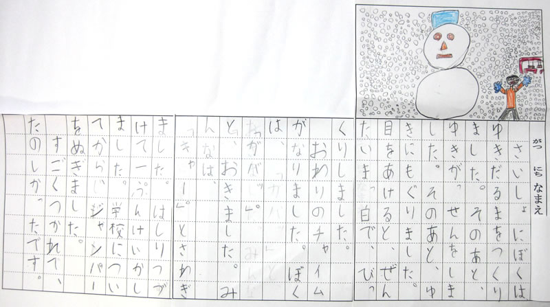 雪遊びの感想を絵日記にまとめる活動をした。以前に比べて,文のつながりや文の組み立てに注意しながら気が付いたことや楽しかった思い出をたくさん書くことができるようになってきた。